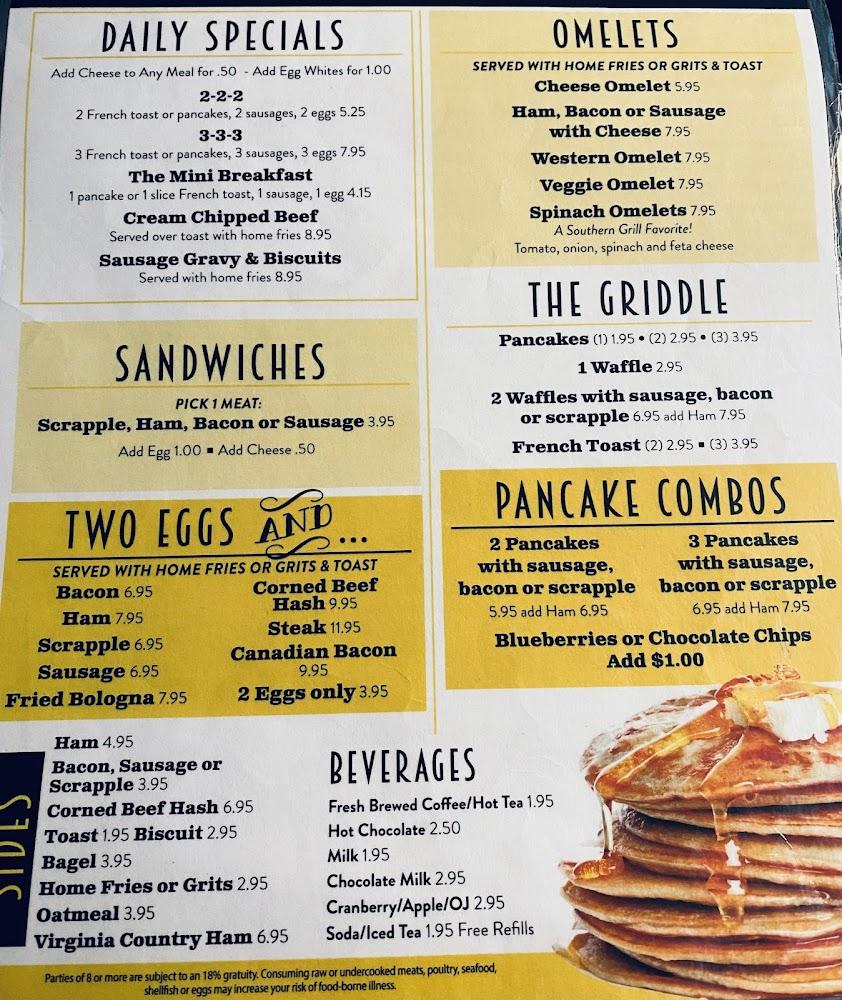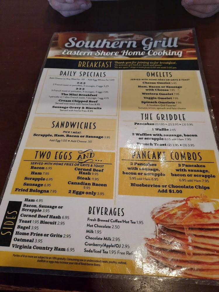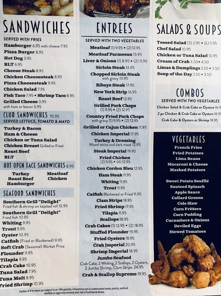 Southern Grill's menu features comfort food for every craving. Breakfast offers specialties like creamed chipped beef and pancakes that dominate the morning. Lunch and dinner present options from fried chicken and seafood sandwiches to meatloaf and hearty entrees.